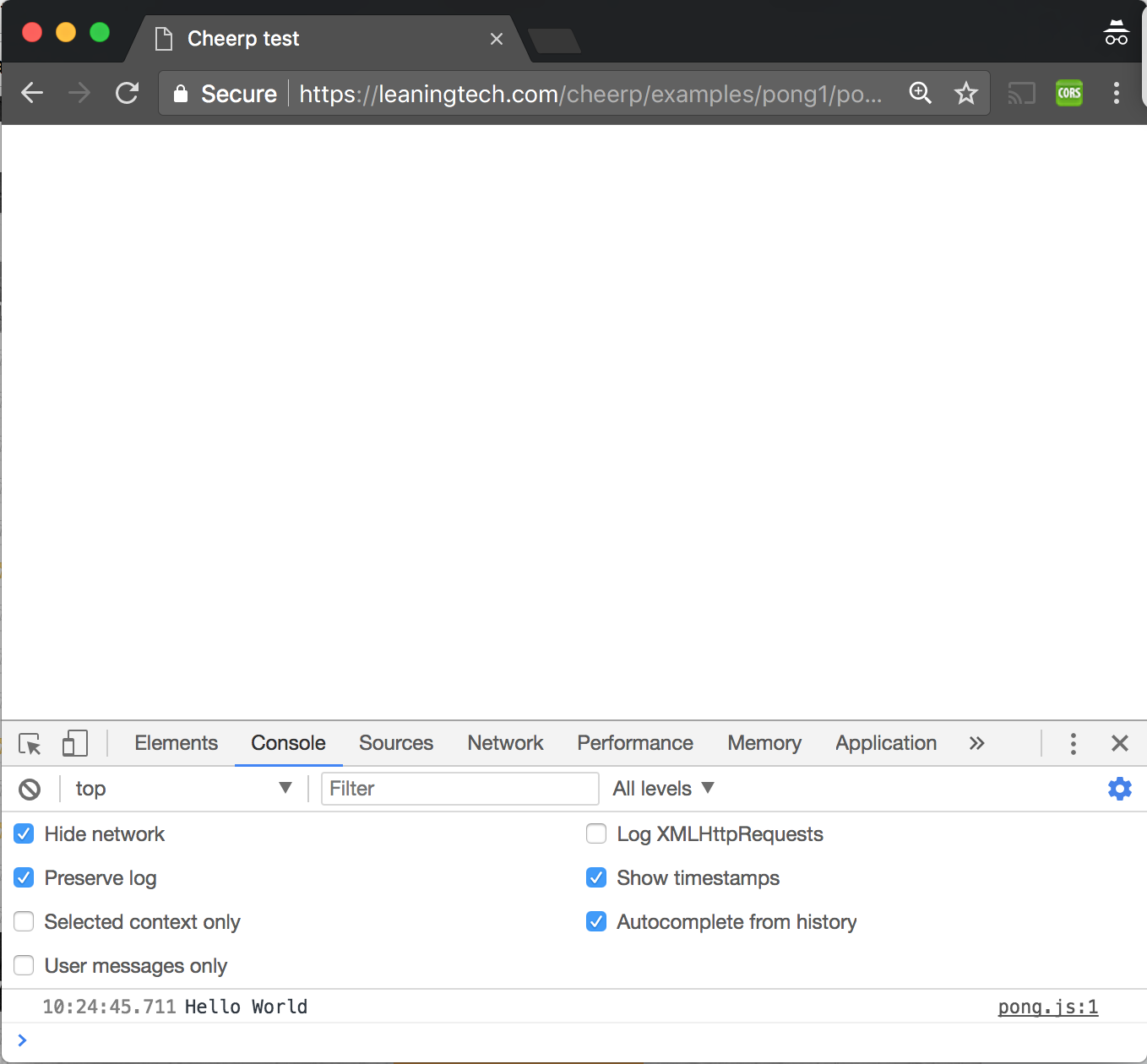 This command will generate two files: a JavaScript loader (pong.js) and a WebAssembly binary (pong.wasm). We will need both files to run the application on a browser. When using Cheerp in mixed-output mode, the JavaScript output will also include all the JavaScript output code, which will be normally used to interact with the DOM or any external JavaScript library.